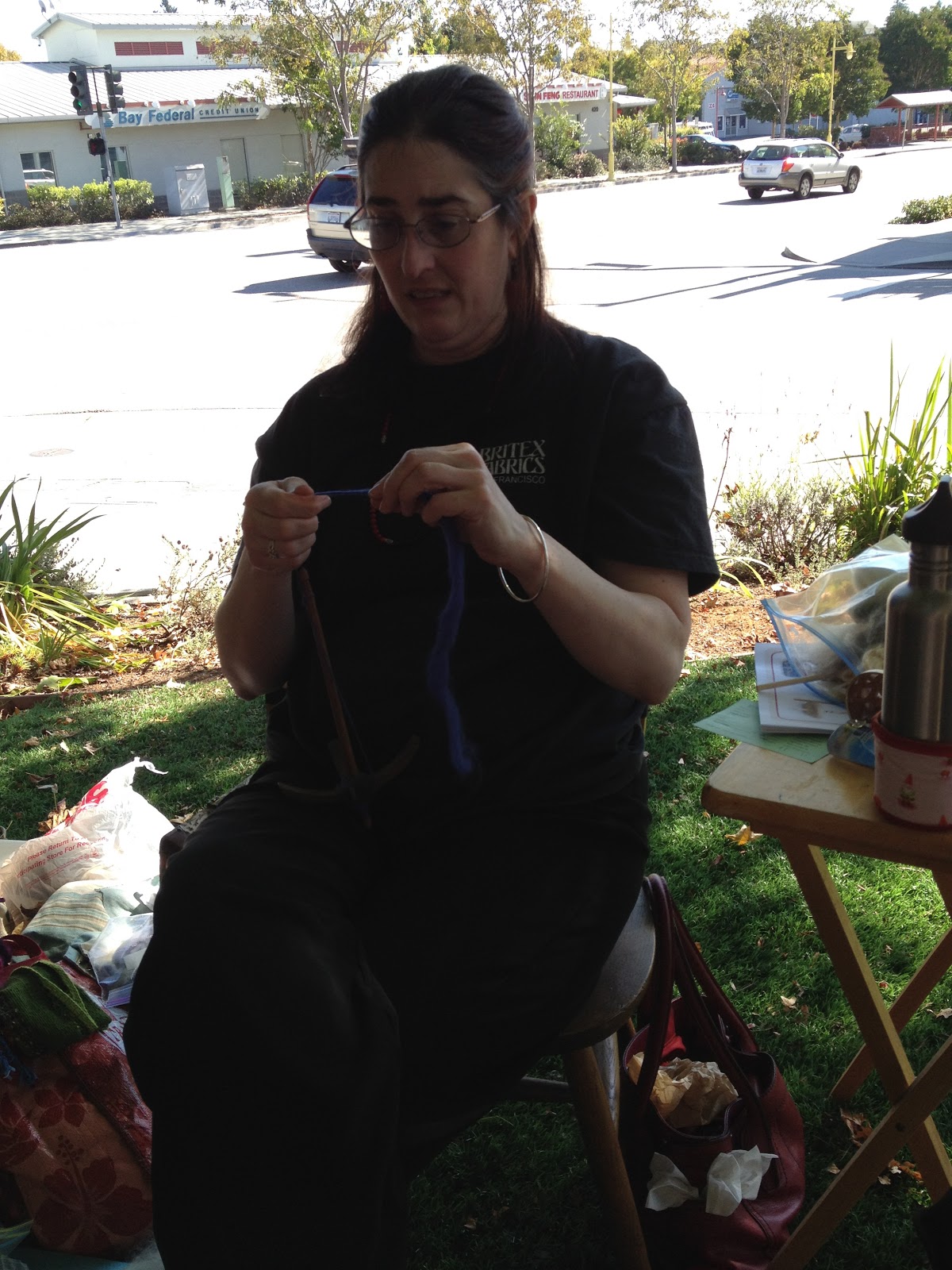 Today my friend Maggie and I taught a beginning spinning class at the Golden Fleece in Santa Cruz. The weather was fantstic, almost 90 degrees and October 23rd! So we went out side and sat under the tree for our class. IT was a wonderful class . We have 4 new spinners, who took home fiber bags, and a simple drop spindle to practice, november 6th we meet again for a spinning wheel class for those who want to learn wheel spinning.