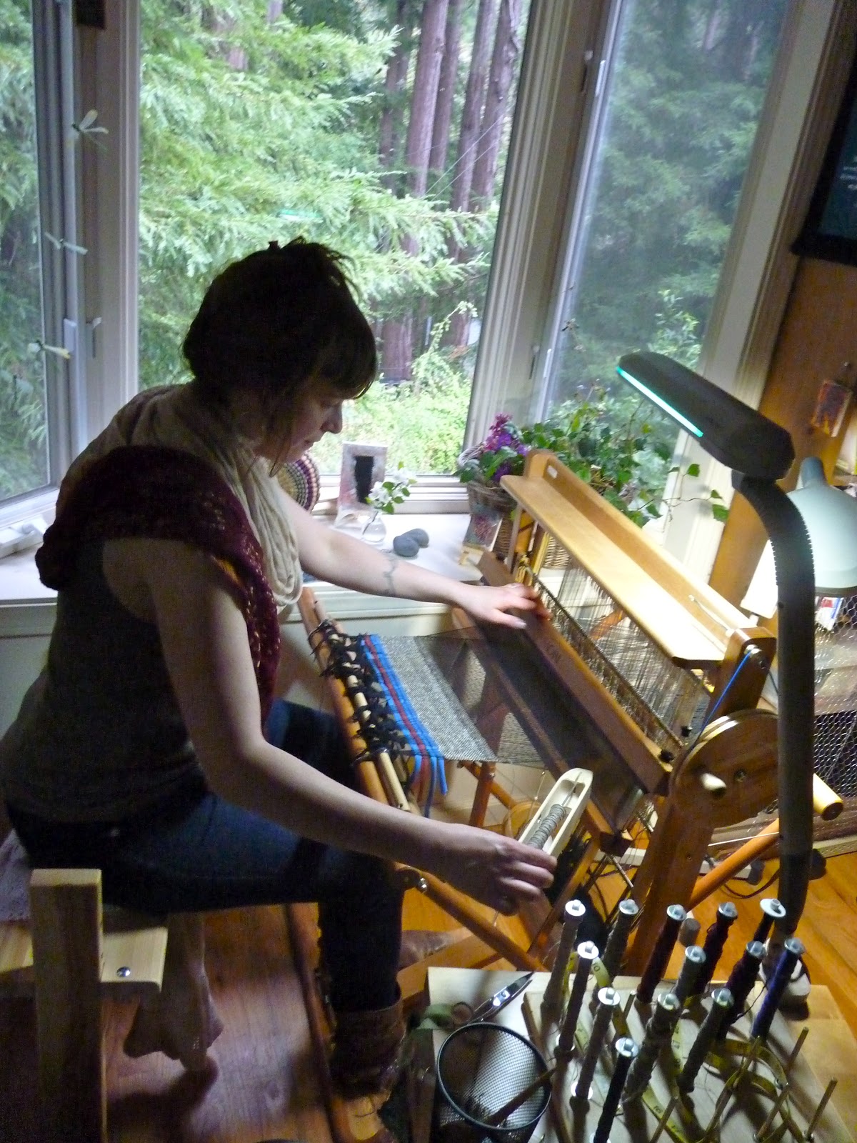 Her sewing studio is so lovely with a spool rack containing a rainbow of colors to choose from And also a handy place to hang her scissors.