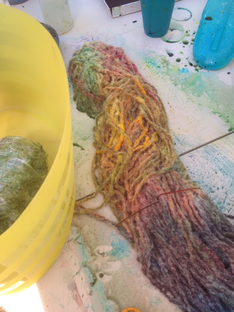First step DAY 1: Hand paint the skeins with low impact safe acid dyes.