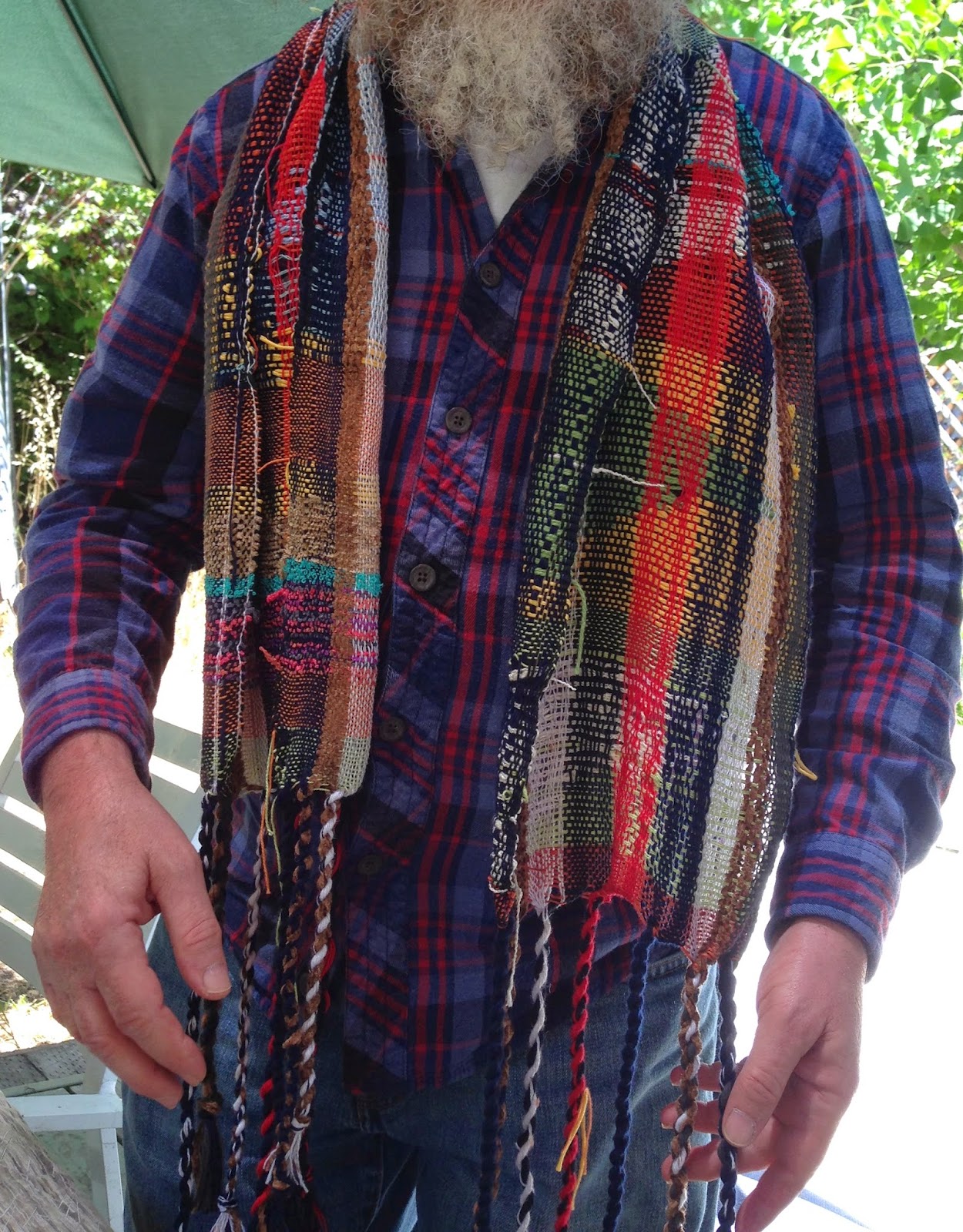 Our class time ran out all to soon but he will trim the loose ends after he soaks and hand washes and line drys his new Saori scarf at home. Congratulations! Mark, is still in physical therapy for his back after surgery but he still can weave on a Saori loom .