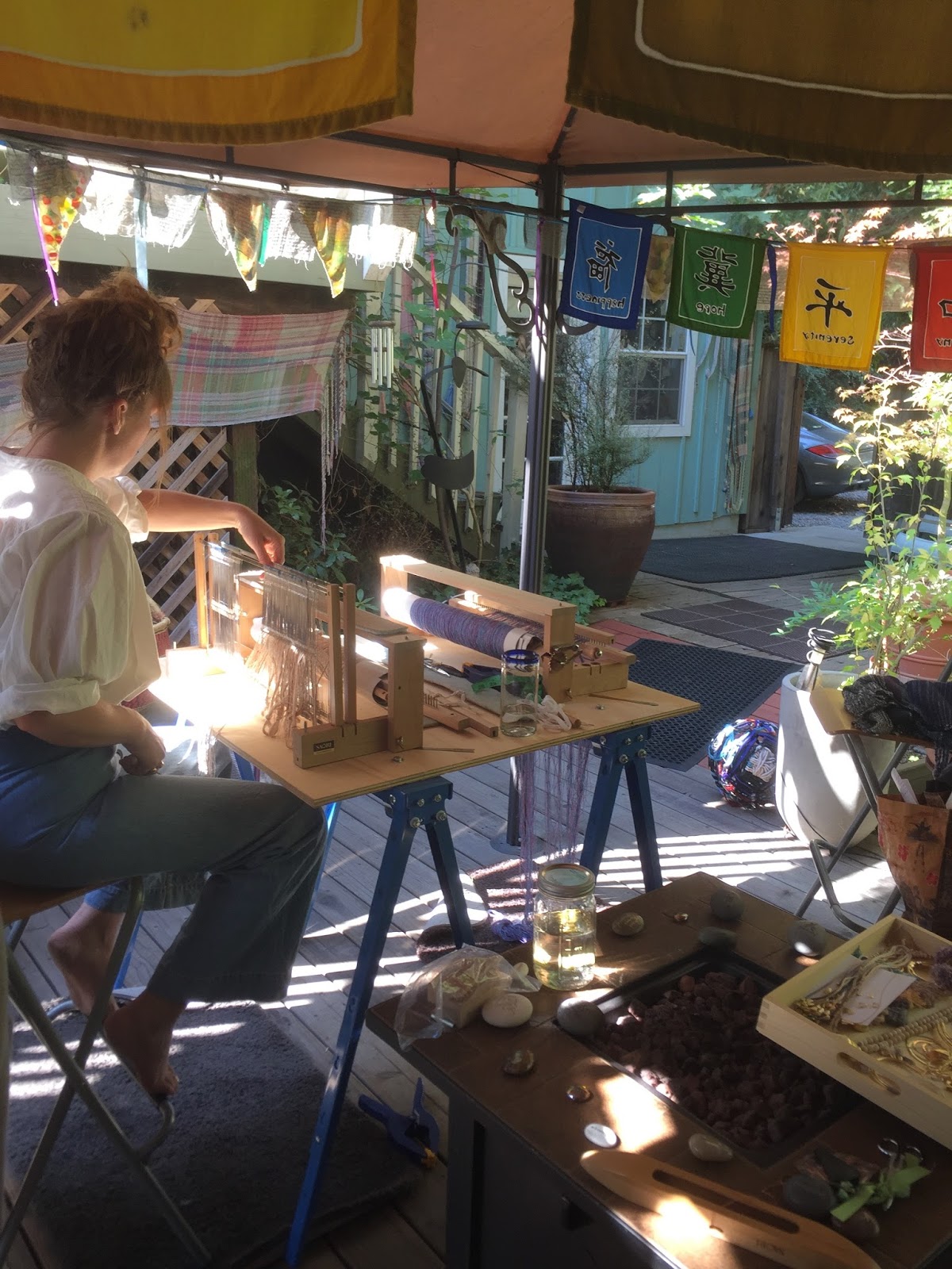 the warm fall afternoons lured me out to the teaching deck to weave today! my piccolo is so easy to at only 15 lbs to carry!